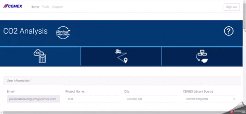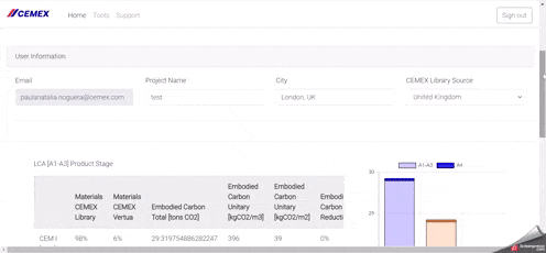 Définissez les informations relatives à votre projet et découvrez l'empreinte carbone intrinsèque du modèle actuel sur la base des produits que vous avez choisis, puis comparez-la avec la base de référence fondée sur le ciment CEM I. Les informations disponibles comprennent les émissions provenant des matières premières et du cycle de production, jusqu'à la livraison du produit final. Vous aurez accès à la liste de tous les produits que vous avez appliqués à votre projet et à leurs caractéristiques.