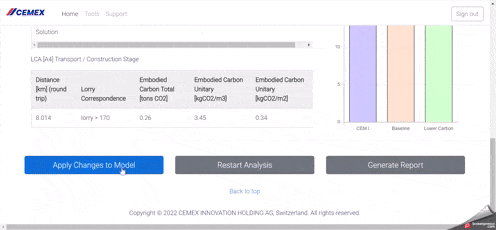 Jetez un coup d'œil au résumé où vous trouverez l'empreinte carbone intrinsèque totale et la comparaison entre le CEM I, votre solution actuelle et le produit alternatif à faible teneur en carbone que le calculateur a suggéré pour rendre votre projet plus durable.